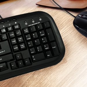 Teclado multimedia en español con teclas de acceso rápido, diseño de escritura silenciosa, resistente a derrames de agua y alta comodidad. En compañía de un mouse con sensor óptico de alta resolución.